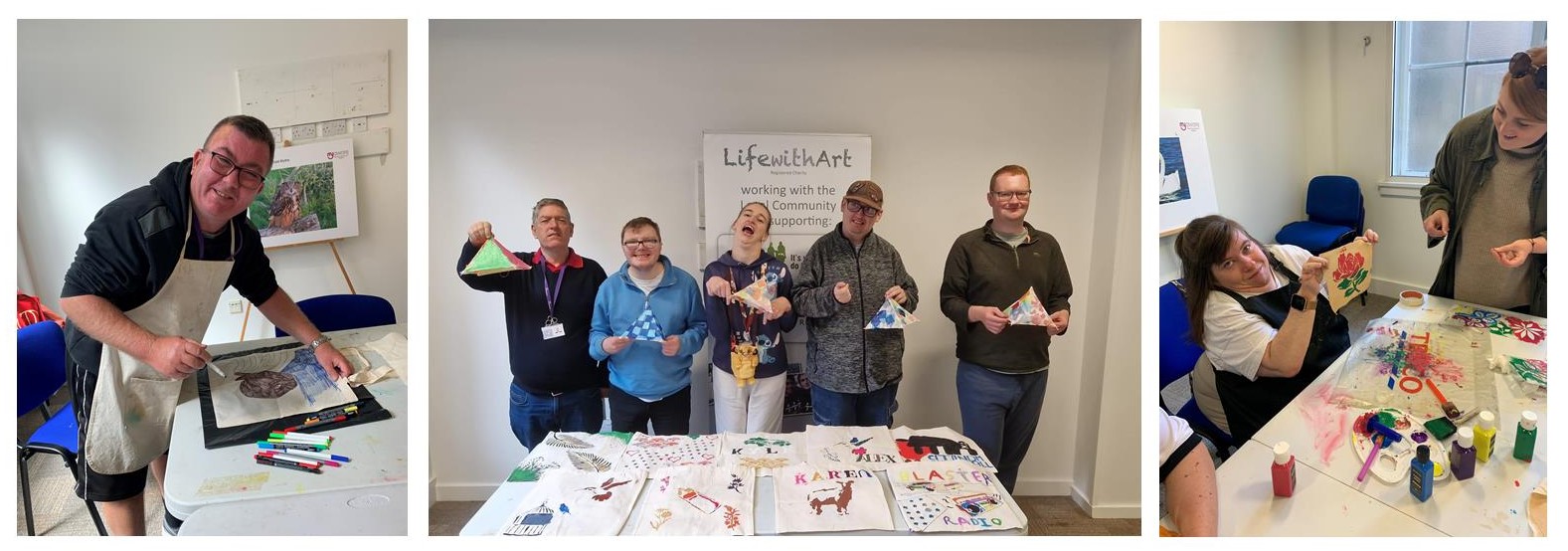 Over six weeks, the group explored using tea, coffee, turmeric and cinnamon to create a striking base colour on their fabric totes. Personality and vibrancy were added to the bags using stencils and fabric paints to create unique designs, with themes ranging from wildflowers to music. The group had a fantastic time nurturing their creativity and are excited to show off their brilliant work.